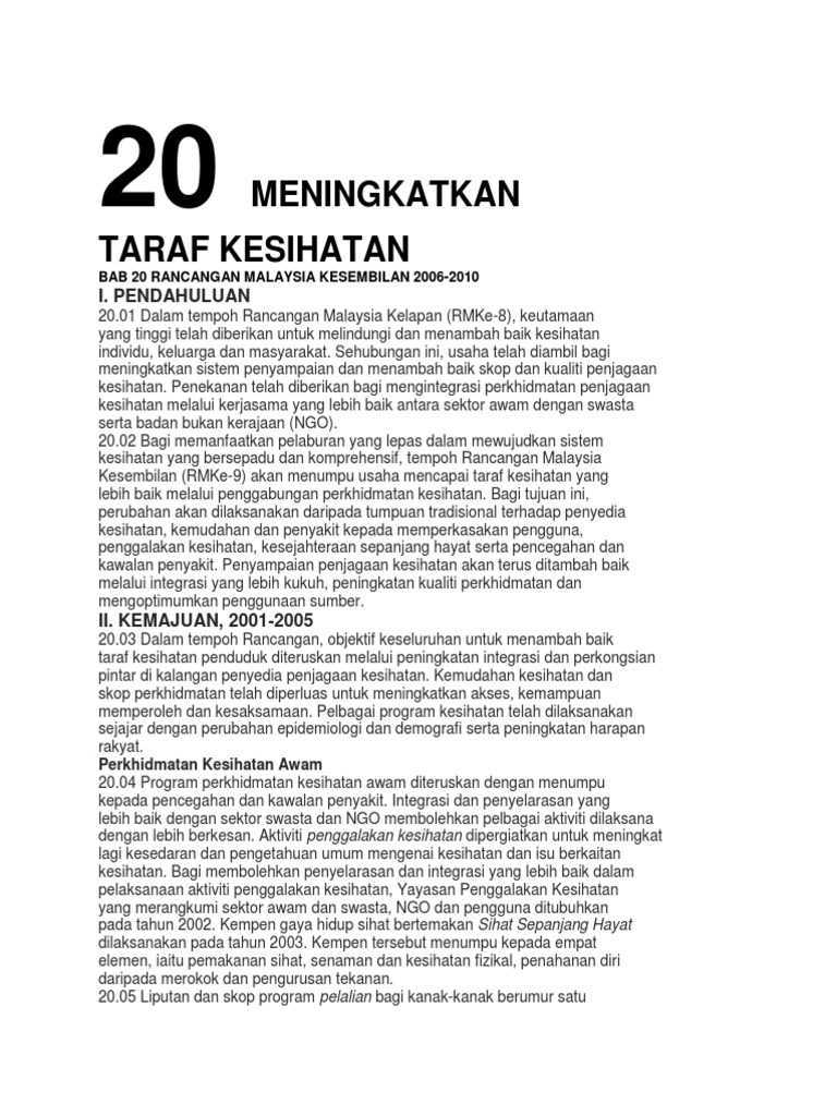 Cara-cara meningkatkan taraf kesihatan rakyat Malaysiac. Badan Kesihatan Sedunia WHO mendefinisikan kesihatan sebagai satu tahap.